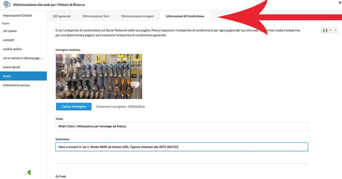 Per fare in modo che ogni pagina del sito sia accattivante DEVI impostare le info di condivisione. Ovvero l’immagine, il titolo e la descrizione che la pagina avrà nel momento in cui ne condividi il link sui social network.
