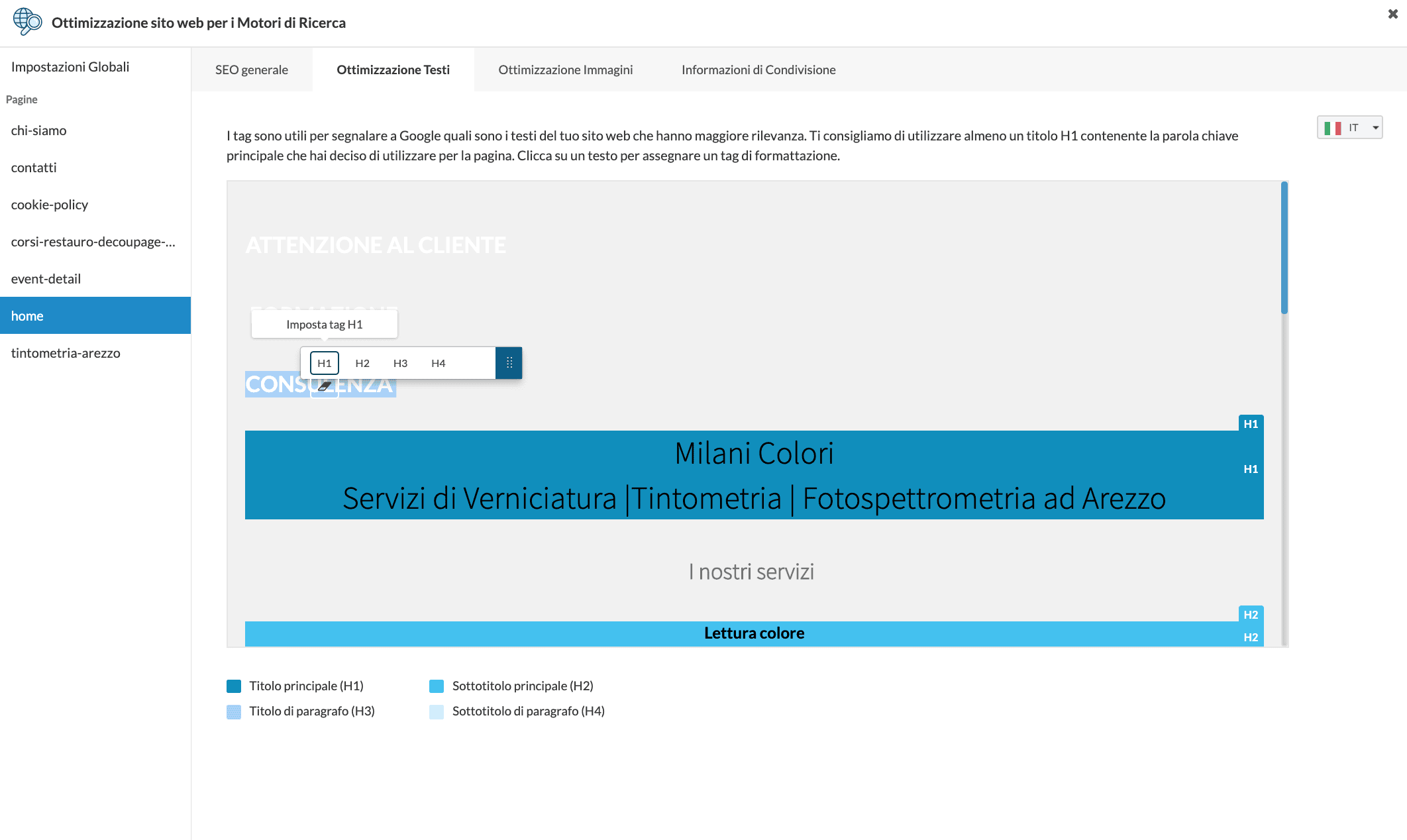 Attribuisci i giusti meta tag a tutti i contenuti testuali. È molto importante assicurarsi che per ogni pagina ci sia un solo titolo h1, che indica l’argomento principale della pagina. Ti basta selezionare il titolo e scegliere quale meta tag utilizzare. Come puoi vedere dalle immagini qui sotto, impostare tutto correttamente è facile e veloce.
