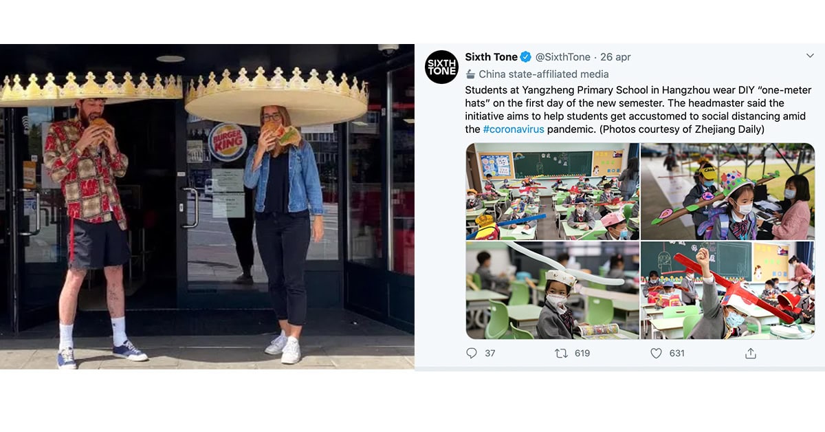 Arrivano i cappelli pro distanziamento sociale. Non seguono i dettami dell’alta moda italiana o di quella francese, certo, ma in fatto di funzionalità sono praticamente imbattibili. Quindi, ottimo lavoro! Li sperimentano i bimbi in Cina, per mantenere le distanze in modo allegro, ma sfrutta l’idea anche il colosso del fastfood Burger King.