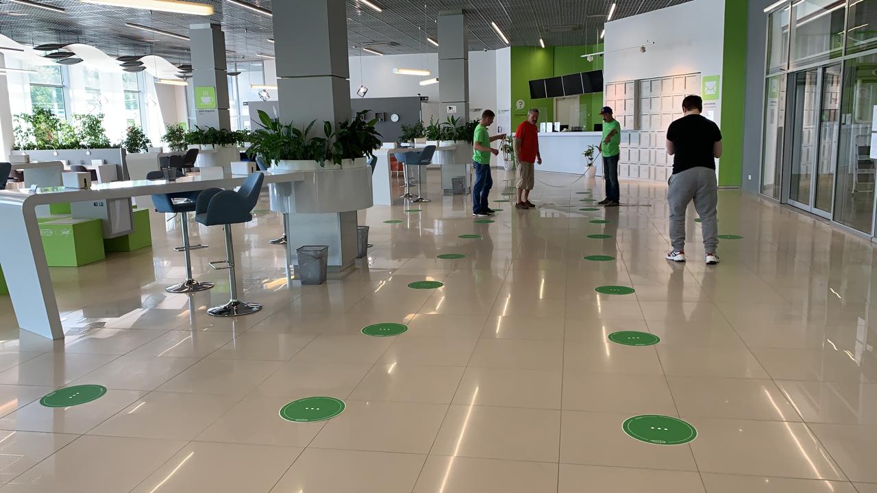 Il sistema si compone di snodi segnalatori incollati sul pavimento, che sfrutta l’utilizzo di pois di diametro di 50 cm in tre colori, verde, giallo e rosso, applicati a 1,50 mt l’uno dall’altro. I pois vanno a creare una griglia verticale di distanze di sicurezza.